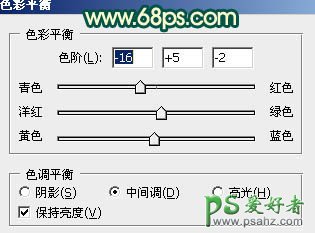 3、创建色彩平衡调整图层,对阴影,中间值,高光进行调整,参数设置如图4 - 6,确定后把图层不透明度改为:30%,效果如图7。