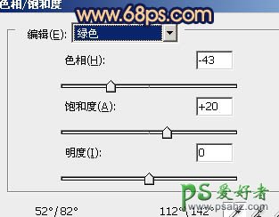 1、打开原图素材,创建色相/饱和度调整图层,选择绿色,再用吸管吸取背景树林绿色,然后调整数值,参数设置如图1,这一步主要是调整背景部分的颜色,效果如图2。