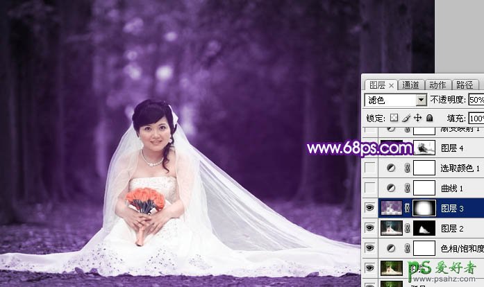 3、按Ctrl + Alt + ~ 调出高光选区,按Ctrl + Shift + I 反选,新建一个图层填充颜色:#530D6E,图层混合模式改为“滤色”,不透明度改为:50%,加上图层蒙版,用黑色画笔把边角部分擦出来,效果如下图。