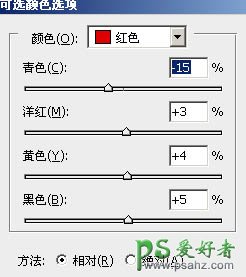 6、创建可选颜色调整图层,对红,黄进行调整,参数设置如图16,17,确定后完成最终效果。