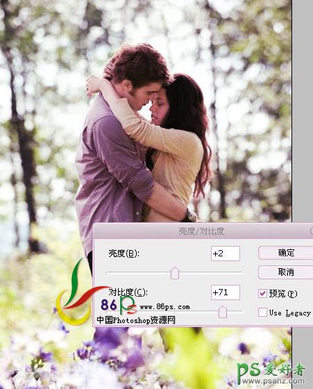 4、执行图层 > 新建调整图层 > 亮度/对比度调整层,降低亮度,提高对比度。
