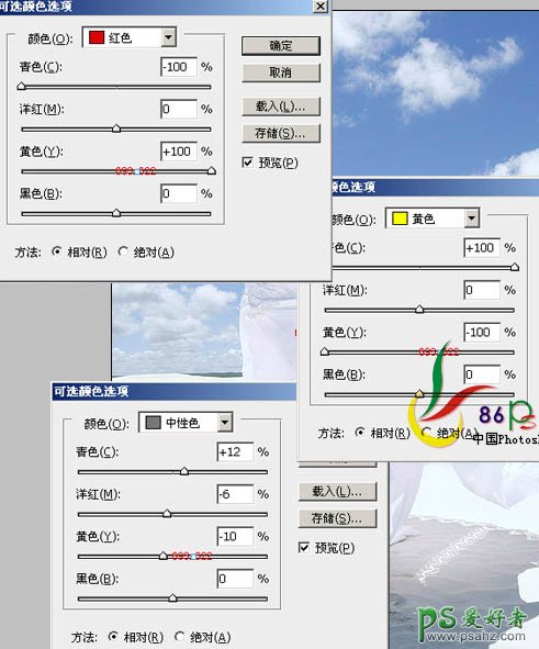 3、再建可选颜色,调整红色、黄色、中性色,参数及效果如下: