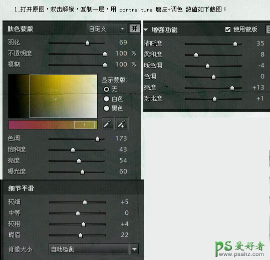 1、打开原图素材,双击把背景图层解锁,然后用外挂滤镜Portraiture进行磨皮及调色,参数设置如下图。没有这款滤镜可以去网上下载。