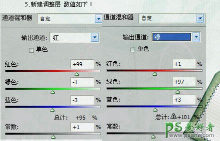 5、创建通道混合器调整图层,对红,绿进行调整,参数设置如下图。