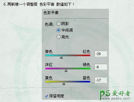 6、创建色彩平衡调整图层,对中间调进行调整,参数设置如下图。