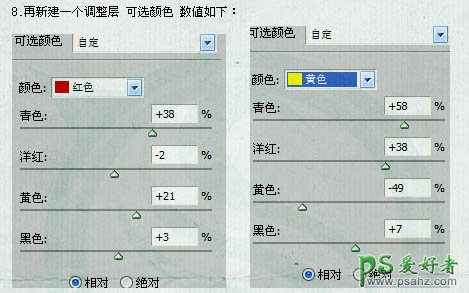 8、创建可选颜色调整图层,对个通道进行调整,参数设置如下图。
