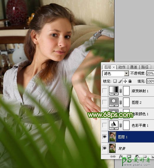 1、打开原图素材,按Ctrl + J 把背景图层复制一层,图层混合模式改为“滤色”,不透明度改为:20%,简单调亮一下图片,效果如图1。