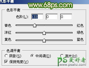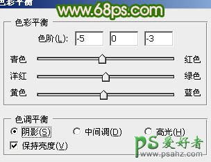 2、创建色彩平衡调整图层,对阴影,中间调,高光进行调整,参数设置如图2 - 4,操作目的是把图片的主色调成绿色,效果如图5。