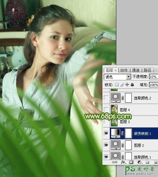 5、创建渐变映射调整图层,颜色设置如图13,确定后把图层混合模式改为“滤色”,不透明度改为:10%,效果如图14。