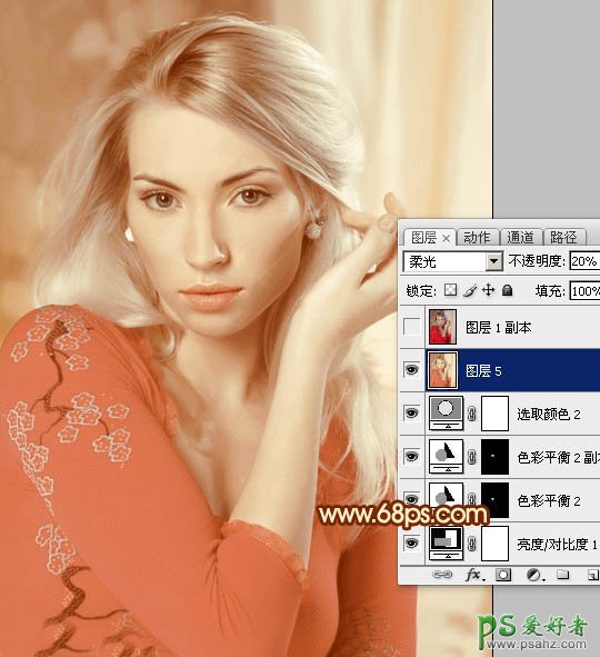 14、新建一个图层,盖印图层。执行:滤镜 > 模糊 > 高斯模糊,数值为5,确定后把图层混合模式改为“柔光”,不透明度改为:20%,效果如下图。