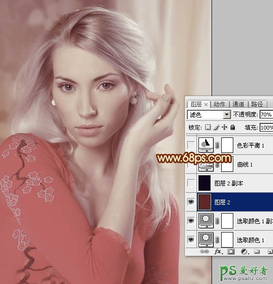 4、新建一个图层,填充暗红色:#5F2726,图层混合模式改为“滤色”,不透明度改为:70%,效果如下图。