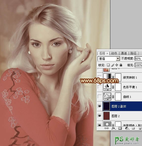5、新建一个图层,填充暗红色:#10061B,图层混合模式改为“差值”,不透明度改为:50%,效果如下图。