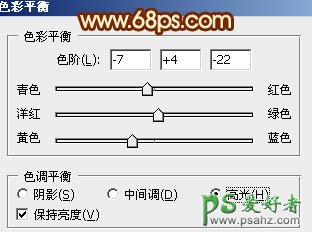 7、创建色彩平衡调整图层,对中间调及高光进行调整,参数设置如图15,16,确定后把图层不透明度改为:50%,效果如图17。