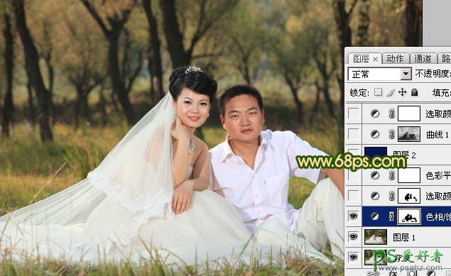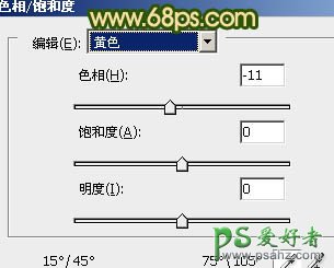 2、创建色相/饱和度调整图层,对黄色进行调整,参数设置如图2,确定后用黑色画笔把人物部分擦出来。这一步操作目的是把背景暖色增强一点,效果如图3。
