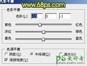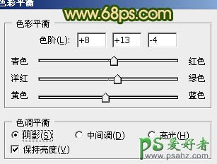 4、创建色彩平衡调整图层,对阴影,中间调,高光进行调整,参数设置如图8 - 10,效果如图11。