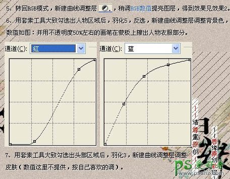 6、用套索工具大致勾出人物区域后,按Ctrl + Alt + D 羽化5个像素,按Ctrl + Shift + I 反选,创建曲线调整图层,调整背景色,对红,蓝进行调整,参数设置如下图。 7、用套索工具大致勾选出头部区域后,羽化3个像素,创建曲线调整图层,调整皮肤,数值自定。