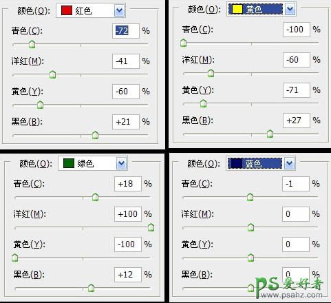 2、创建可选颜色调整层,分别对红色,黄色,绿色,蓝色,洋红,中性色,黑色进行调整,参数及效果如下图: