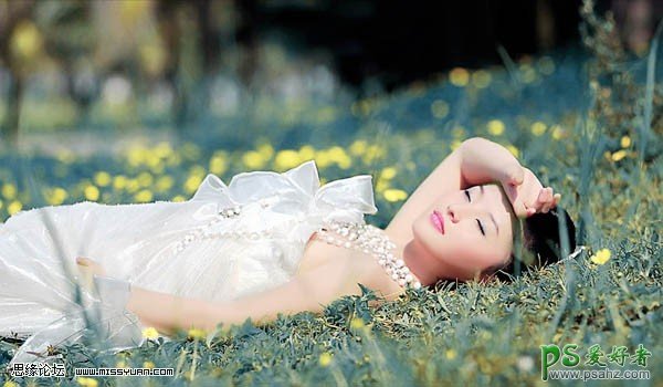 PS给趟在草地上的迷情少女婚纱写真照调出暗调特效