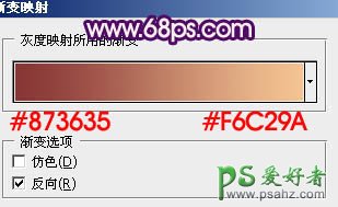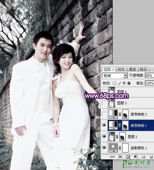4、调出当前图层蒙版选区,创建渐变映射调整图层,颜色设置如图6,确定后把图层混合模式改为“色相”,不透明度改为:30%,效果如图7。