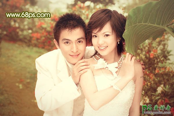 PS婚片后期调色教程,PS调色教程:给靓男靓女婚纱艺术照调出典雅的黄绿色,本教程介绍较为柔美的婚片调色方法。大致过程:先对图片润色处理,色调以暗调黄绿色为主,需要把背景及人物分开来调色。大致调色后需要用模糊后的图片叠加做出柔化效果,并适当加