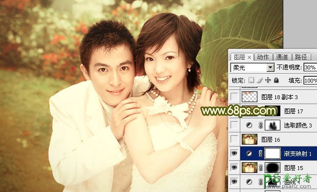 16、创建渐变映射调整图层,颜色设置如图27,确定后把图层混合模式改为“柔光”,不透明度改为:30%,效果如图28。
