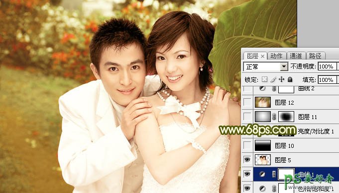 PS调色教程:给靓男靓女婚纱艺术照调出典雅的黄绿色
