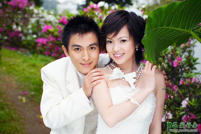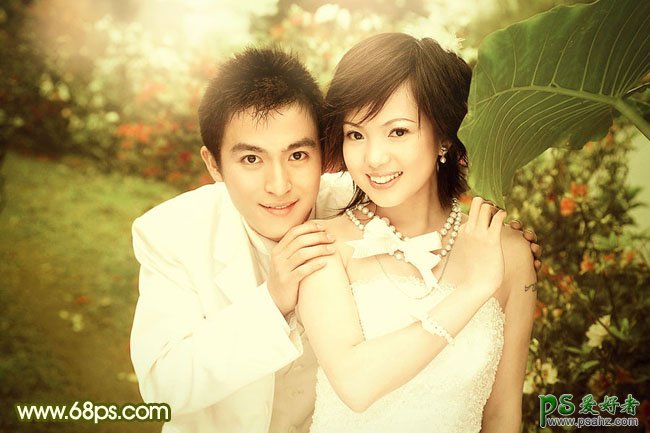 PS婚片后期调色教程,PS调色教程:给靓男靓女婚纱艺术照调出典雅的黄绿色,本教程介绍较为柔美的婚片调色方法。大致过程:先对图片润色处理,色调以暗调黄绿色为主,需要把背景及人物分开来调色。大致调色后需要用模糊后的图片叠加做出柔化效果,并适当加上暗角和高光,这样处理后的照片看上去非常柔美。