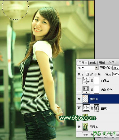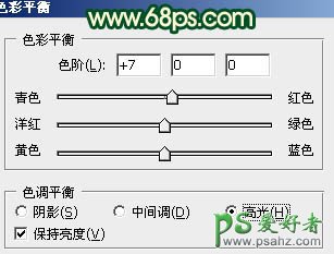 8、创建色彩平衡调整图层,对高光进行调整,参数设置如图22,确定后新建一个图层,图层混合模式改为“滤色”,不透明度改为:60%,把前景颜色设置为:#FEB507,用画笔把图23所示选区部分涂上高光,效果如图23。
