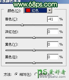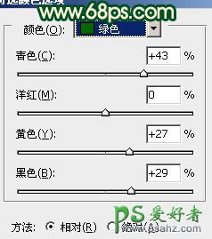 9、创建可选颜色调整图层,对红色及绿色进行调整,参数设置如图24,25,效果如图26。