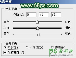 2、创建色彩平衡调整图层,分别对阴影,中间调,高光进行调整,参数设置如图3 - 5,效果如图6。