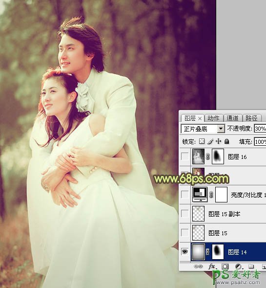 10、新建一个图层,选择渐变工具,由中间至边角拉出白色至黑色线性渐变。确定后把图层混合模式改为“正片叠底”,不透明度改为:30%,加上图层蒙版,用黑色画笔把人物部分擦出来,效果如下图。