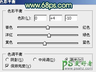 14、创建色彩平衡调整图层,对中间调,高光进行调整,参数设置如图24,25,确定后把图层不透明度改为:50%,效果如图26。