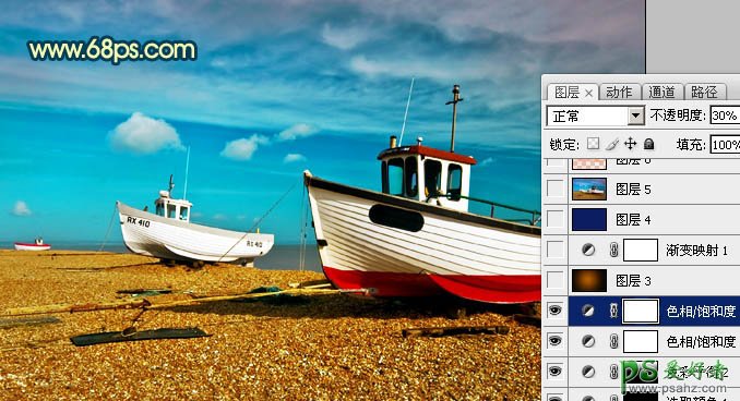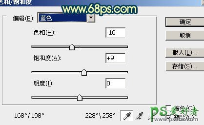 6、创建色相/饱和度调整图层,选择蓝色,用吸管吸取天空部分的颜色,参数设置如图13,确定后把当前图层调整图层再复制一层,图层不透明度改为:30%,效果如图14。