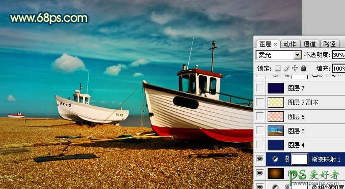 8、创建渐变映射调整图层,颜色设置为黑白如图17,确定后把图层混合模式改为“柔光”,不透明度改为:30%,效果如图18。