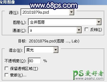 14、新建一个图层,盖印图层。选择菜单:图像 > 模式 > Lab颜色,在弹出的菜单选择不合拼,确定后执行:图像 > 应用图像,参数设置如图24,确定后再选择菜单:图像 > 模式 > RGB 颜色,效果如图25。