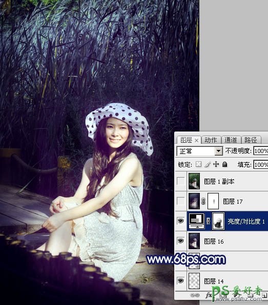 PS调色教程:给公园里的MM照片调出暗紫艺术效果