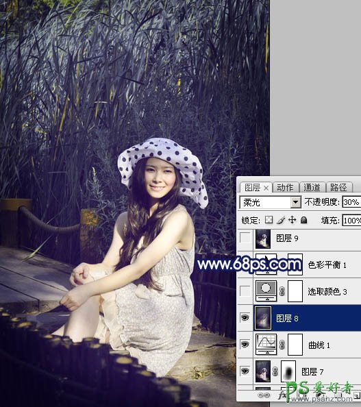 PS调色教程:给公园里的MM照片调出暗紫艺术效果