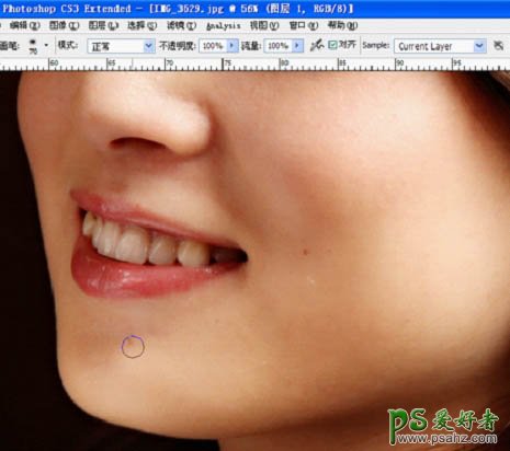 2、对磨皮后皮肤还存在的一些瑕疵进行单独修饰,可用仿制图章,如下图: