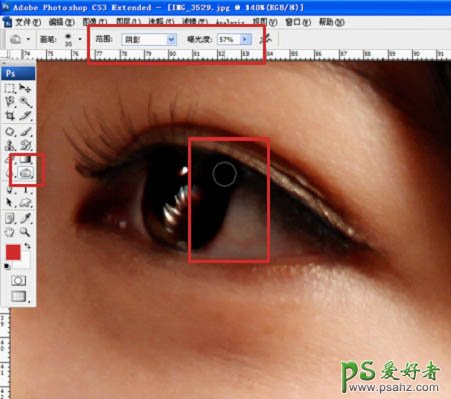3、利用减淡和加深工具分别对眼睛进行修饰,是眼睛更有神,减淡和加深工具在修饰眼睛是的设置如下图,减淡用高光,加深用阴影,曝光度可以适当的降低。