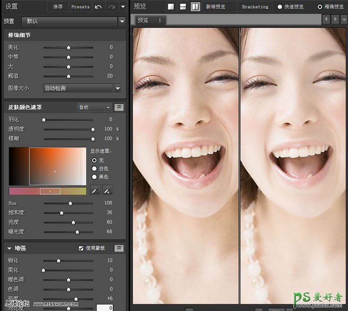 1、用PS打开原图,先图像调成自动色阶,然后复制一层图层1,转入Portraiture滤镜进行磨皮(参数如图),处理完以后再用noisewarepro滤镜进行锐化(参数如图),处理完之后记得建立图层蒙版,在图层蒙版上把一些感觉模糊的地方擦掉。