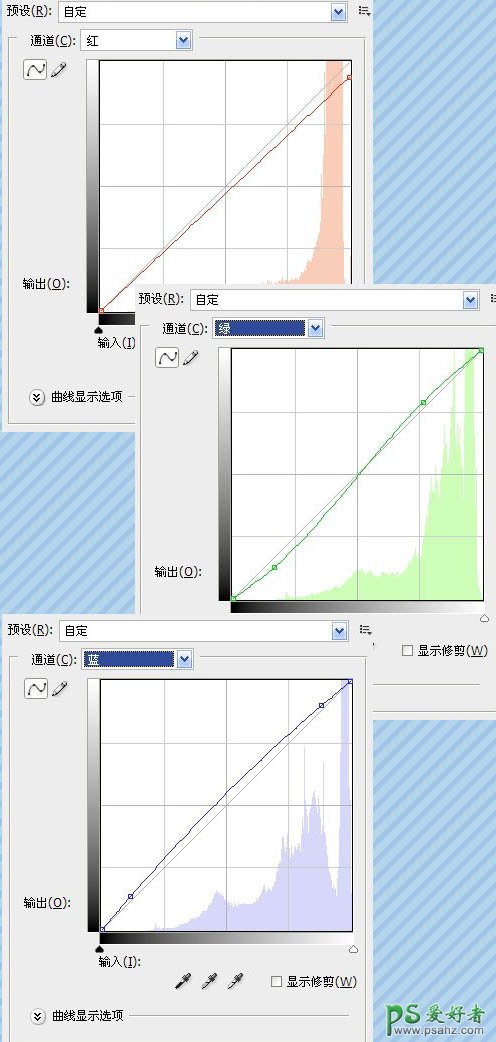 5、我们来改变一下整体的色调,建立曲线调整层,分别对三个通道进行调整,参数如下图,确定后用画笔工具,降低不透明度来擦拭除皮以外的地方(可以看最后的图层截图)....
