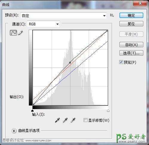 4、再次转到通道,选择RGB通道,载入选区(或者直接按快捷键CRTL+~)回到刚刚的曲线调整层,执行选择-反选,再次建立曲线调整层,参数如下,黑线为RGB下调整,红线为红通道下,蓝线为蓝通道下,参数及效果如下图。