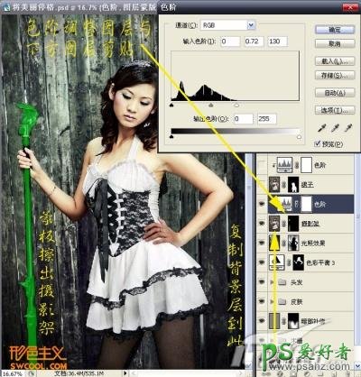21、多次的色彩和亮度调整使得摄影架非常黯淡,与画面整体效果不相符。于是将对其进行调整。复制背景副本到最上层利用蒙板擦去摄影架以外的地方。建立色阶调整图层与摄影架这一层进行剪贴,设置数据如图。