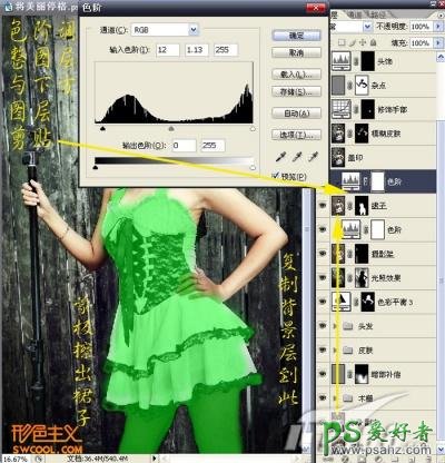 22、同样的方法对裙子进行调整(复制背景副本到最上层利用蒙板擦去裙子以外的地方,建立色阶调整图层与裙子这一层进行剪贴),设置数据如图。 23、盖印一层(CTRL+SHIFT+ALT)。第二部分(人物主体调色)结束。