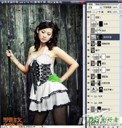 25、由于模特的左手部分受裙子环境光的影响显得过亮,所以新建色阶调整图层(利用蒙板擦去左手以外的部分),如图。