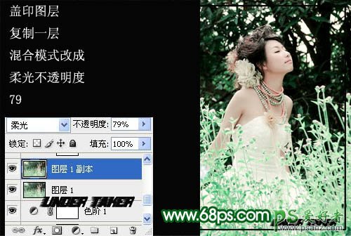 4、新建一个图层,按Ctrl + Alt + Shift + E 盖印图层,图层混合模式改为“柔光”,不透明度改为:79%。