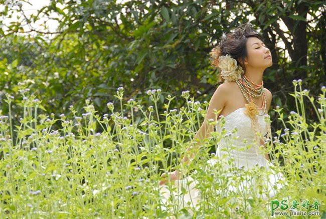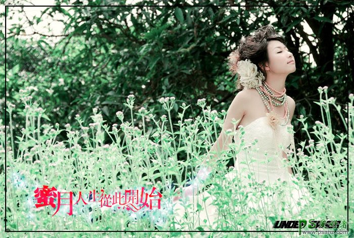 今天我们来教大家学习一篇影楼后期调色,PS婚片后期调色教程,PS调色教程:给蜜月中的美女婚纱艺术照调出清爽绿色效果。本教程介绍较为简单的青绿色婚片调色方法。大致过程:先在Lab模式下用曲线调成图片的主色。然后回到RGB颜色下稍微加强一些色彩层次及细节即可。