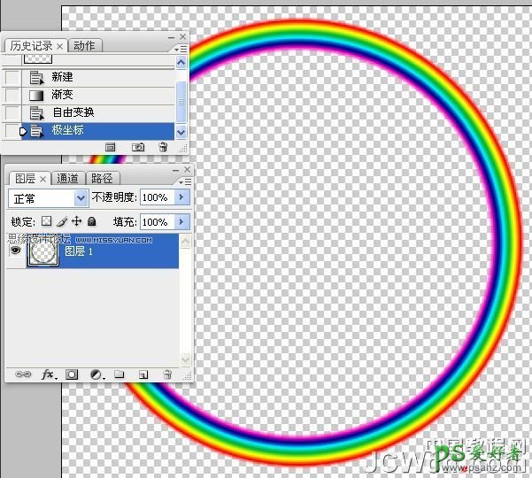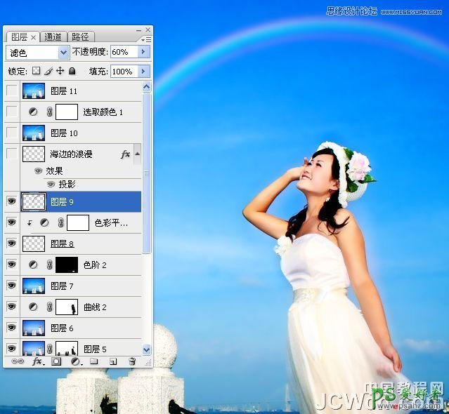 19、拖入做好的彩虹文件,自由变换命令变换其大小和方向。橡皮擦工具擦拭两头不需要的部分。图层混合模式为滤色,执行高斯模糊。不透明度为60%。