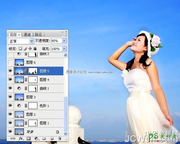 8、盖印图层,执行“表面模糊”滤镜。添加图层蒙版,涂抹出前景及人物不需模糊的区域。修改图层不透明度为80%。