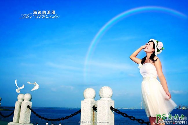 今天我们来教大家学习一篇photoshop影楼后期调色教程,PS婚片后期调色教程,PS调色教程:给海边浪漫的美女婚片调出纯美的蓝色调,让美女图片变亮,本教程不仅介绍图片调色及人物简单美化的方法,同时也介绍了一些图片装饰的方法。如下面的教程,作者特意把画面中加上了鸽子,彩虹,文字等。这些虽然简单,不过有了这些画面会显得更有内涵。